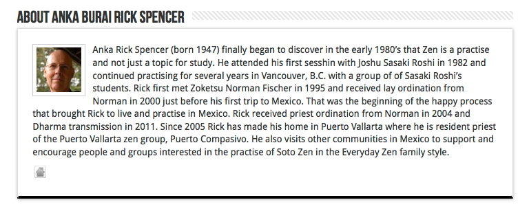 "Anka Rick Spencer (born 1947) finally began to discover in the early 1980's that Zen is a practise and not just a topic for study. He attended his first sesshin with Joshu Sasaki Roshi in 1982 and continued practising for several years in Vancouver, B.C. with a group of of Sasaki Roshi’s students. Rick first met Zoketsu Norman Fischer in 1995 and received lay ordination from Norman in 2000 just before his first trip to Mexico." |
